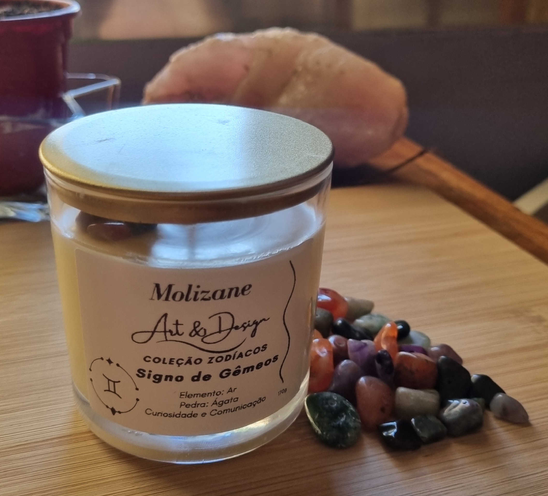 Cada vela acompanha o cristal Ágata, pedra ligada à comunicação, equilíbrio mental e organização de ideias. Ela ajuda a acalmar a mente, trazer foco e favorecer uma expressão mais clara e autêntica – perfeita para o jeito múltiplo e comunicativo de Gêmeos.