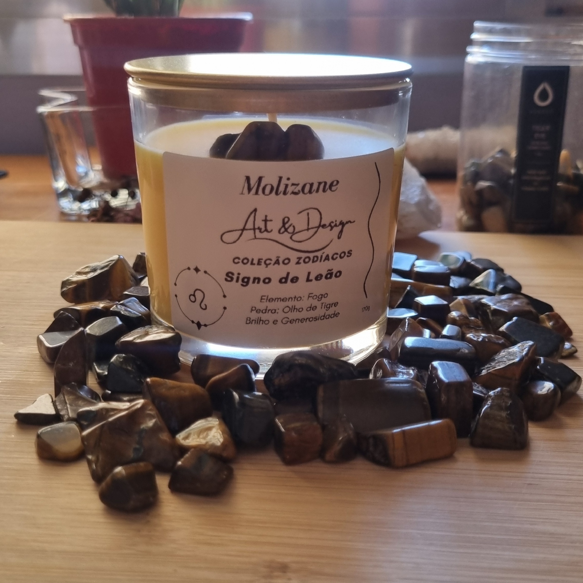 Cada vela acompanha o cristal Olho de Tigre, pedra ligada à coragem, proteção e poder pessoal. Ele fortalece a autoconfiança, ajuda a afastar inveja e energias densas, e incentiva você a ocupar o próprio palco com mais segurança e determinação.