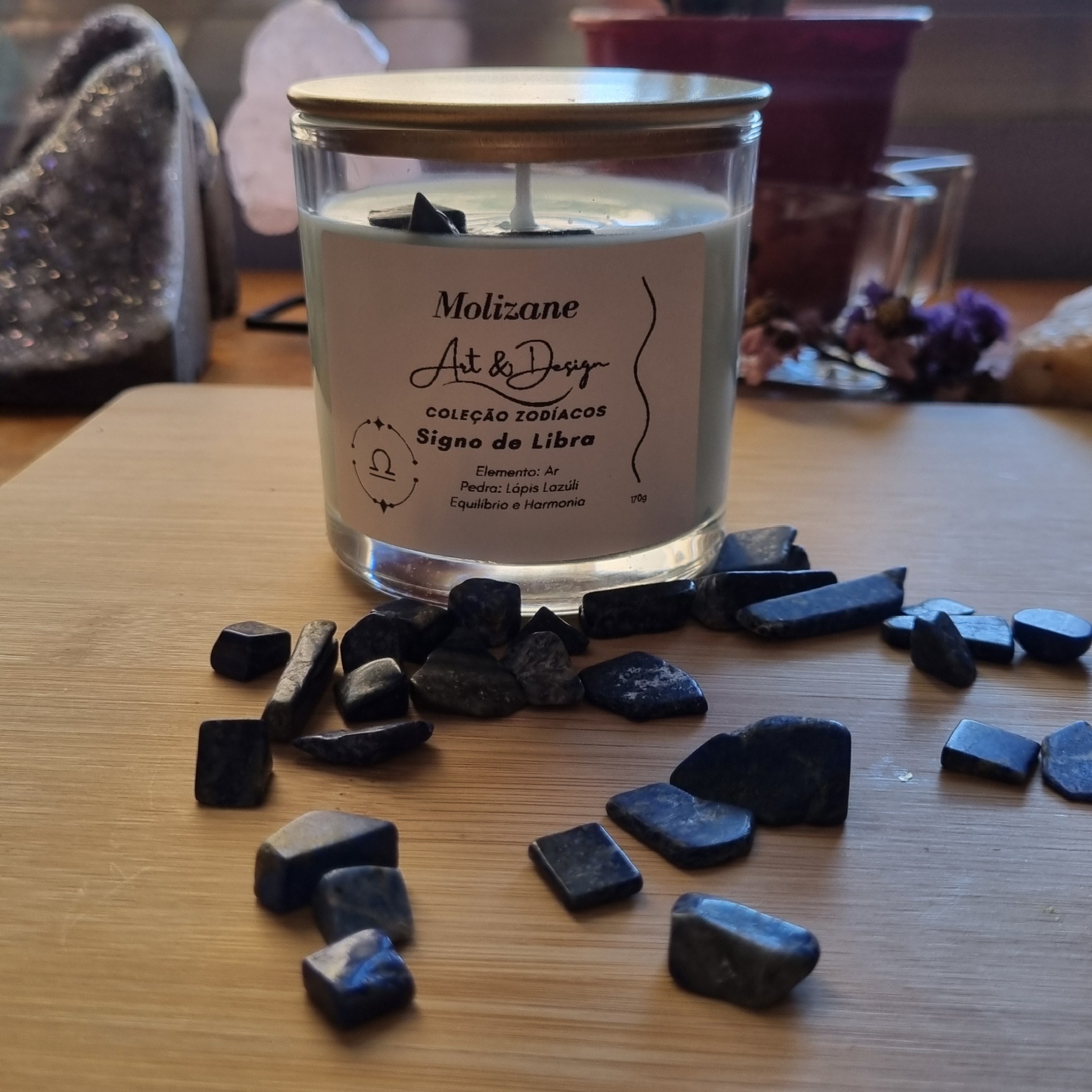 Cada vela acompanha o cristal Lápis-lazúli, pedra ligada à clareza mental, sabedoria e expressão autêntica. Ele favorece a comunicação, ajuda a tomar decisões equilibradas e estimula a busca por justiça e harmonia, em perfeita sintonia com a essência libriana.
