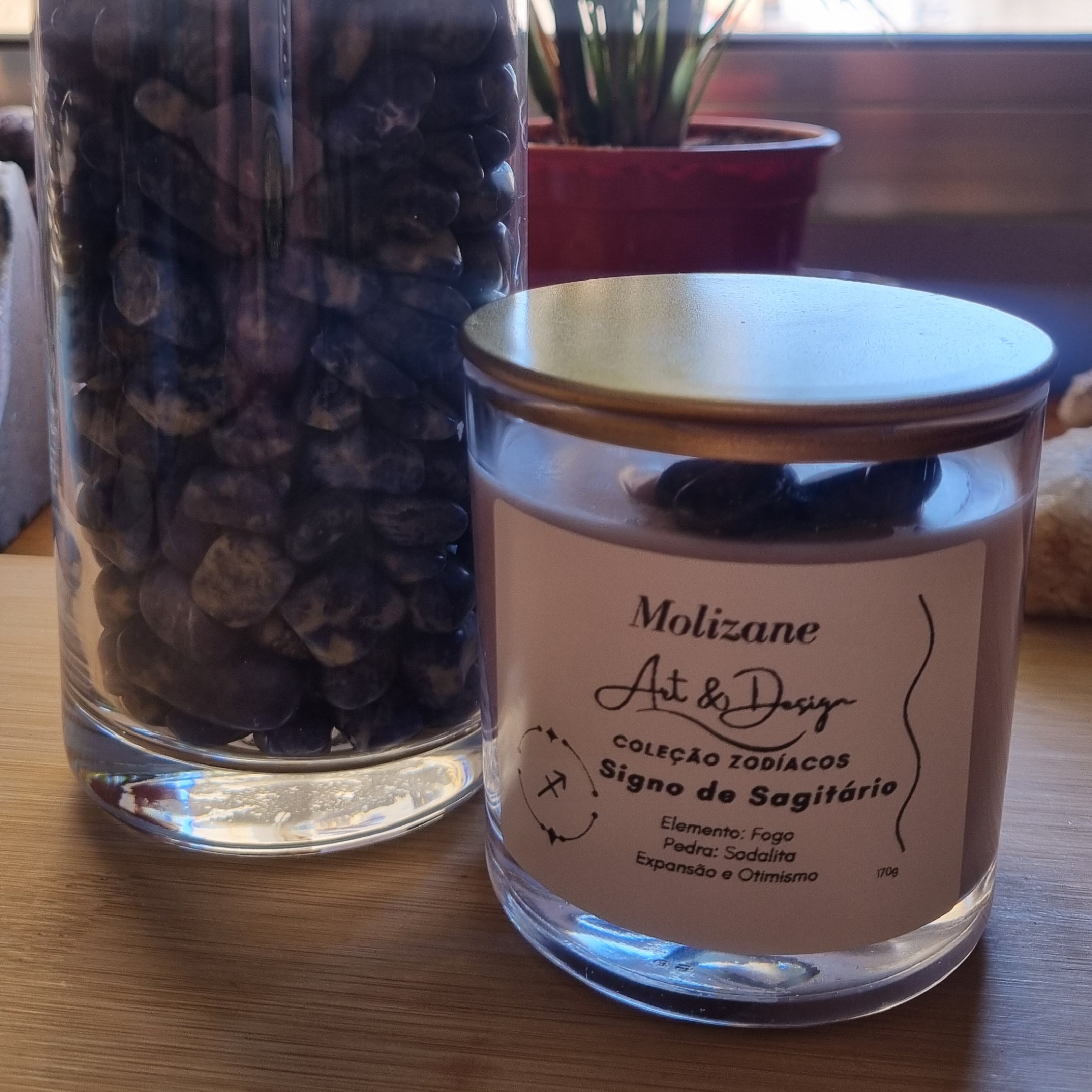 Cada vela acompanha o cristal Sodalita, pedra ligada à intuição, sabedoria e expansão da consciência. Ela favorece estudos, jornadas internas e externas, clareza de pensamento e expressão da verdade, em sintonia com o lado filosófico e visionário de Sagitário.